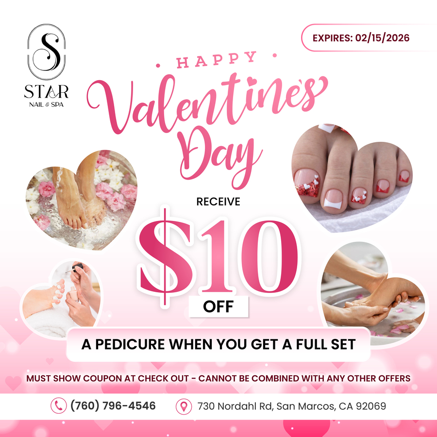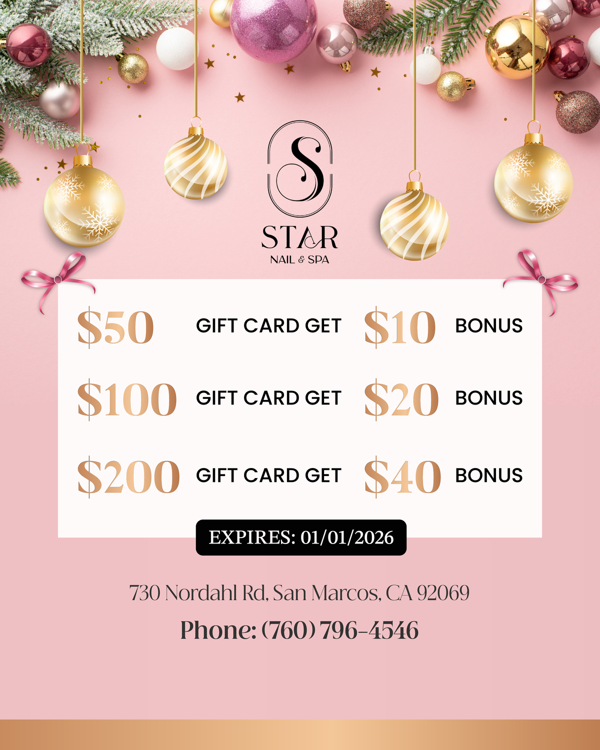 Welcome to Star Nails. Located at a beautiful place in San Marcos, CA 92069. Star Nails offers the ultimate in pampering and restoring your beauty with our whole-hearted, careful & professional staff. Comprehending customer is not an easy task. It’s even harder when it comes to nail art & caring services.